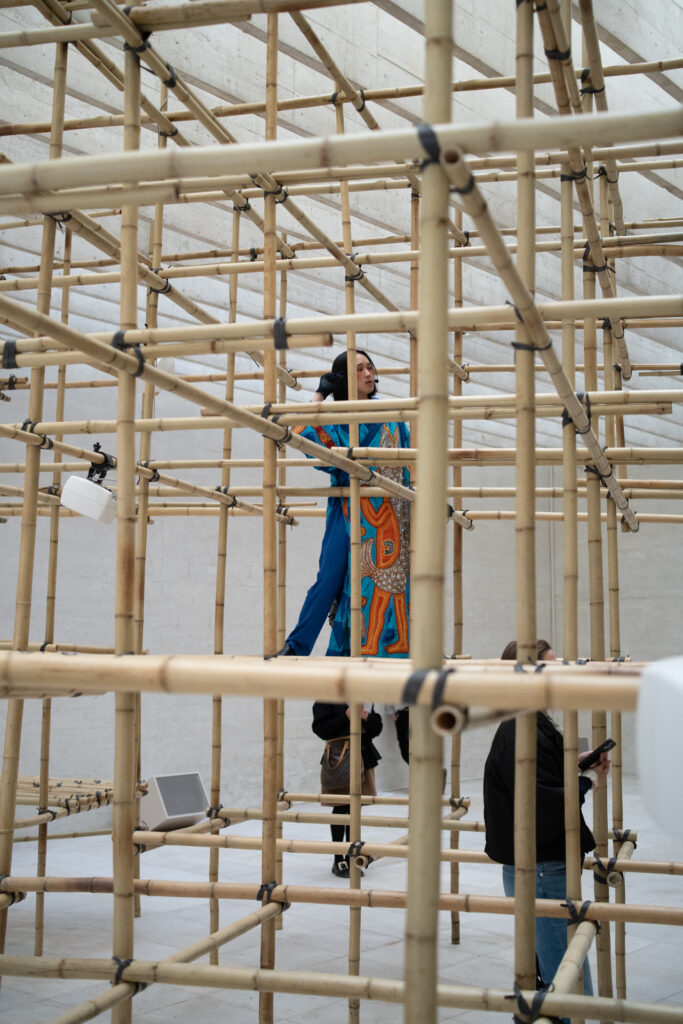 Working with contemporary technology and traditional references and techniques, Lap-See Lam’s generative practice at once claims and complicates the notion of cultural heritage. The score, composed by Tze Yeung Ho, merges Baroque ornamentation and unexpected instruments in melancholic melodies, interspersed with lullabies and poetry that draw on the multilingual background of the artists. Kholod Hawash’s textile works form a sculptural installation in the pavilion.