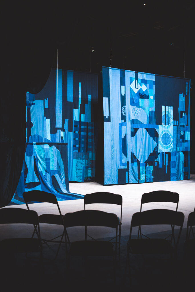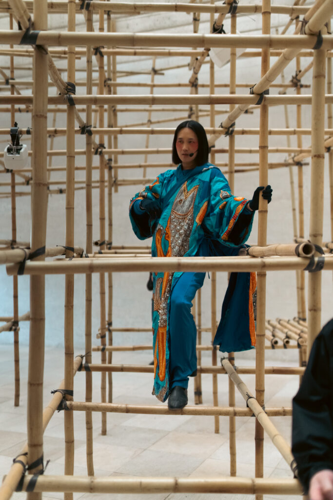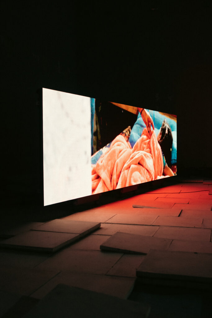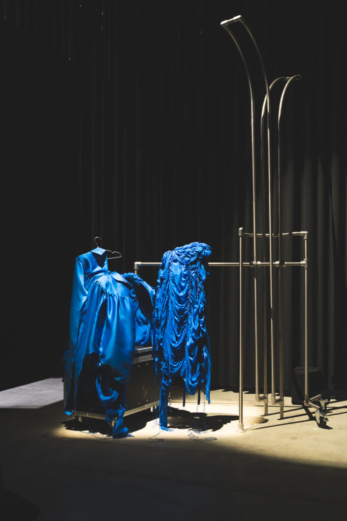 Uzbek diaspora artist Aziza Kadyri explores the experiences of Central Asian women and how they reimagine their identities in the process of migration. In a deconstructed theatre backstage, costumes become sculptures alongside audiovisual work co-created with Tashkent-based Qizlar Collective, rooted in women’s narratives, exploring embodied memories and the relationship between the body and its environment. The installation links Uzbek Suzani embroidery and AI image generation, unveiling AI’s biases and its global impact on shared memories. While in the space, the viewer is invited to embody both the observer and the observed, shifting between states of exposure—changes perceptible only to the onlookers beyond this space of accidental performance.
