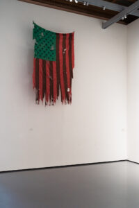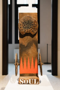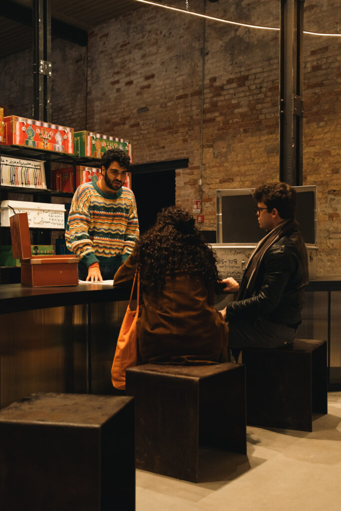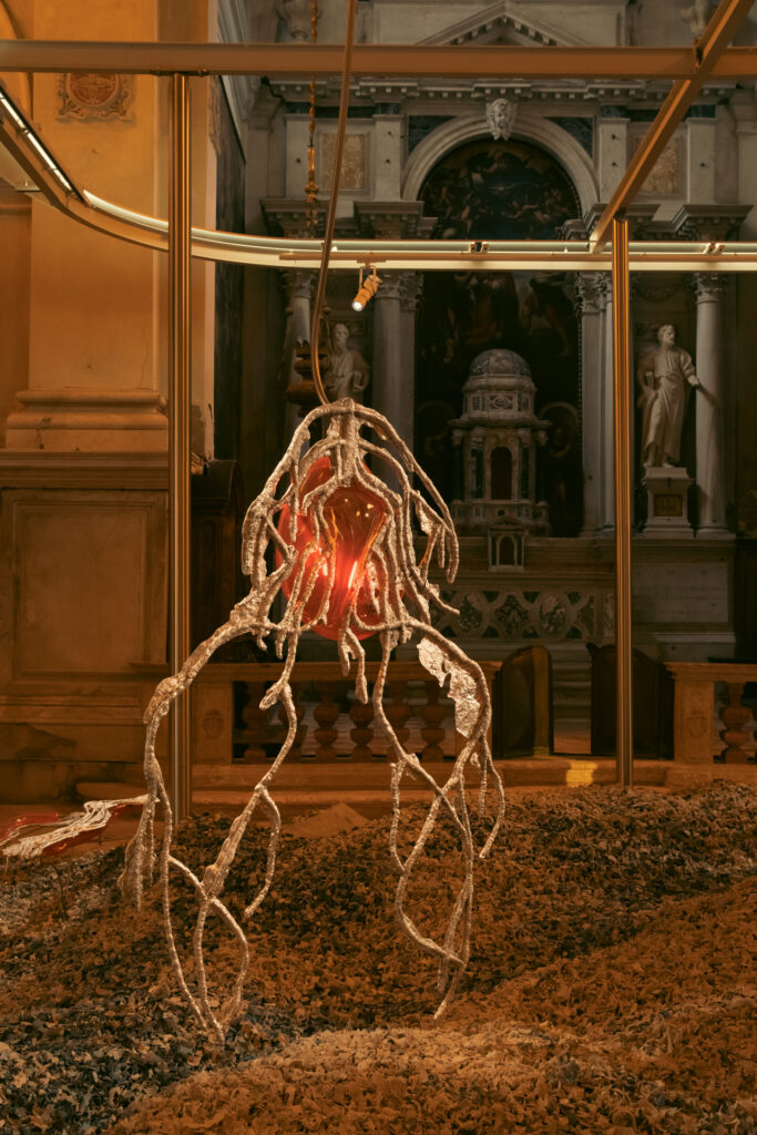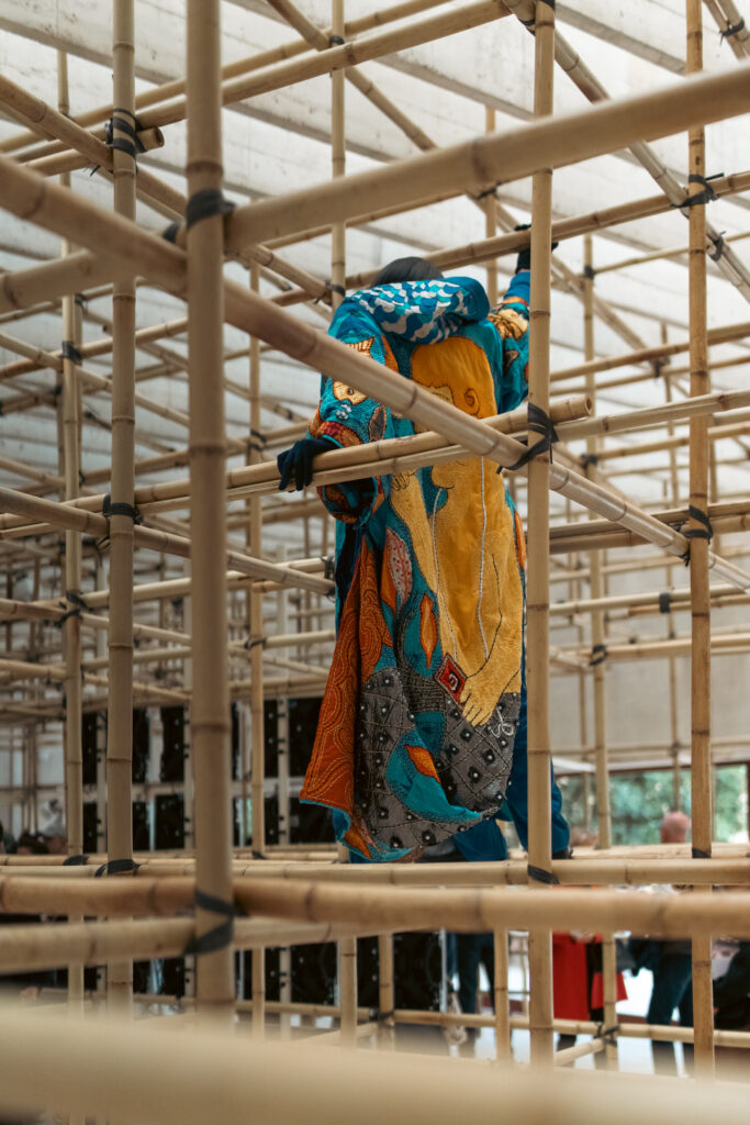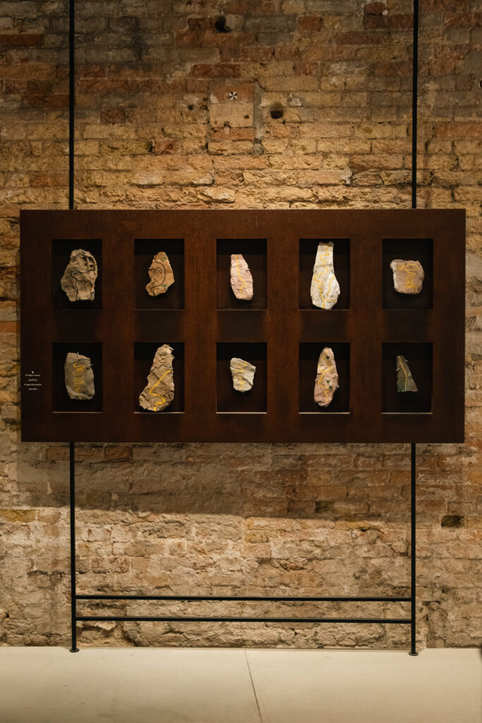 The installation principally consists of conterie (seed beads), historically employed as both currency and items of exchange. Conterie were dispersed globally from the Venetian island of Murano and incorporated into various material cultures. Kiwanga uses these tiny glass units to construct the monumental out of the minute, each bead acting as a witness to past transactions that changed the socioeconomic landscape of the sixteenth century and beyond. The work addresses the often-destructive history of commerce and how the trade of these beads shaped the world. Other materials related to the trade of conterie are also included. They rise from the pavilion’s floor onto the walls and spill out into the courtyard. As they meet the beads, they formalise a place of exchange, prompting reflection on issues of value, aesthetics, and global economic relations.