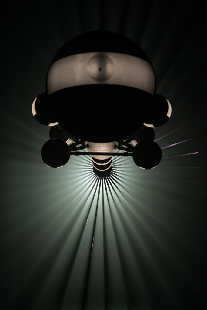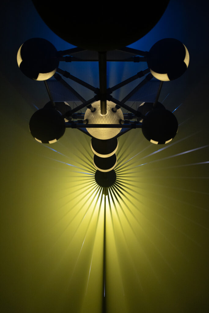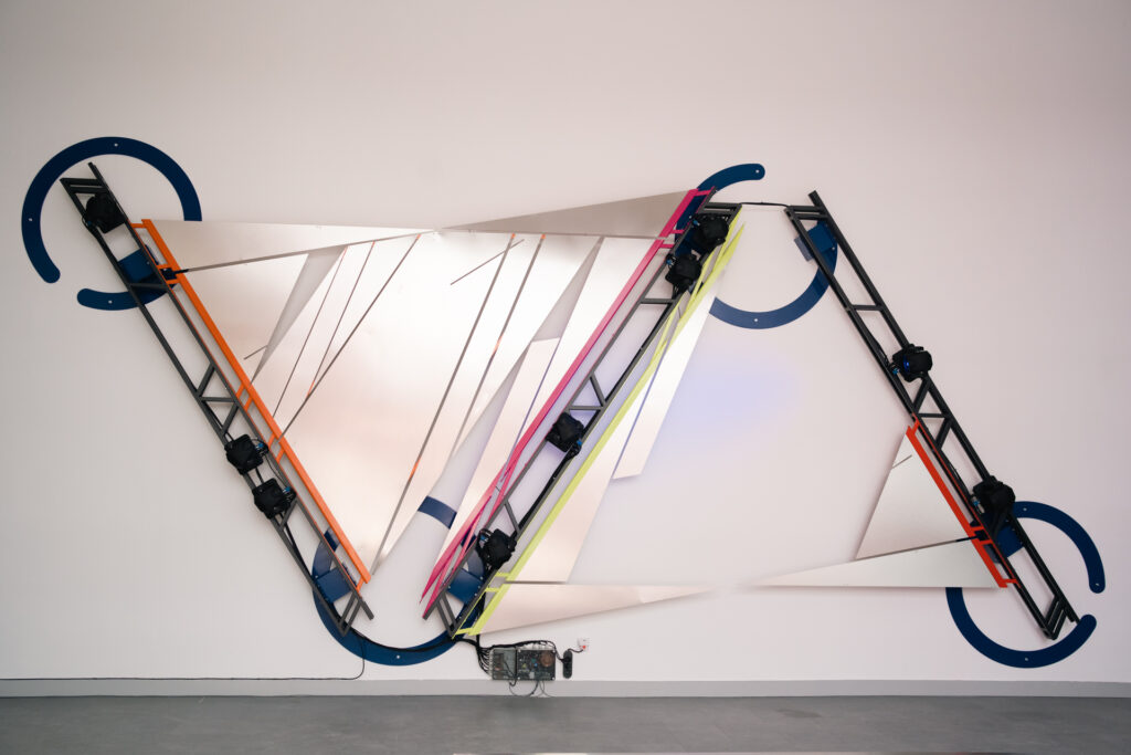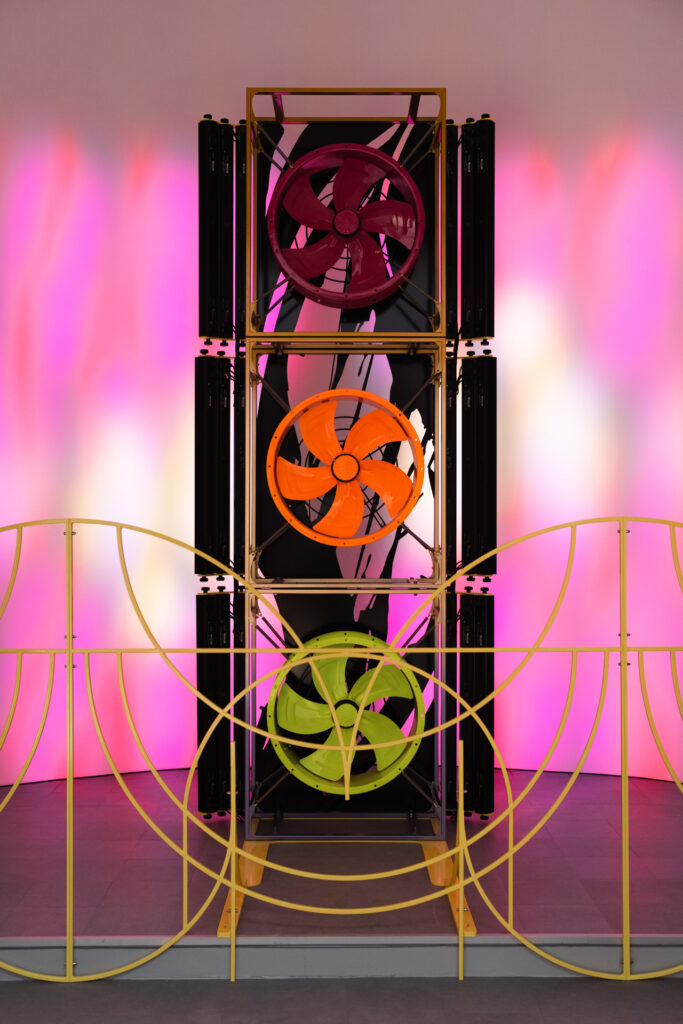 Nemes designed the project Techno Zen as an immersive, painting-based Gesamtkunstwerk that expands to other media. Laser-cut steel, car paint, enamelled steel plate, projection, DMX lights, speakers and coloured fans are the tools that he reinterprets the palette of painting with and makes the environment multisensory: its optical, acoustic and haptic content unfolds through the combined effects of light, colour, movement and sound.