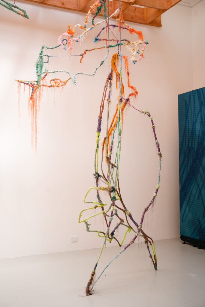 The sight of the matoutou falaise is a gift when it appears in dense forests, on the bark of the Zamana trees or the rocks of the Martinique shores. It requires a deep connection to the environment; an eye that sweeps the contours and glides over the textures. It is about appearances and disappearances, what is given, protected, and also unseen… This way of seeing is undoubtedly what Julien Creuzet strives to offer through the experience of his work. It describes an immersion in a poetry of forms and sounds, volumes and lines in movement, colourful encounters forming new languages: an experience to be lived deeply. This tarantula, endemic to Martinique, could well be the symbol of a way of being with art that history has yet to write. It nourishes, and protects, in the teaching of a sensible and poetic understanding of the world it offers a softer gaze to approach the many ecologies of life. Creuzet’s forms stem from a locus of emancipation, which must be felt to truly see. It is a moment of learning and unlearning as a reconciliation with our senses, as well as a space to be untranslated and liberated.