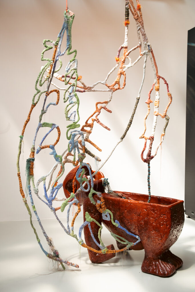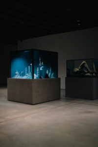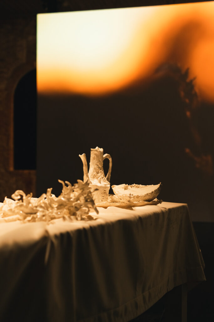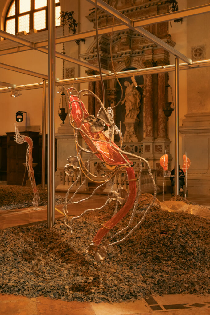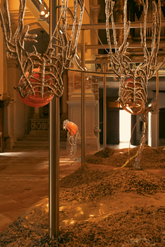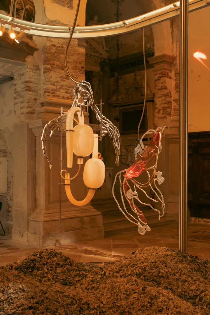 Accordingly, in this delirious post- landscape, it is difficult to distinguish between what is attributed to nature and what is considered a human creation. Objects referring to human bodily systems in a state of inflammation, architecture, a post-natural landscape of plastic soil, light, and other technologies merge into a unified hybrid techno-organism.