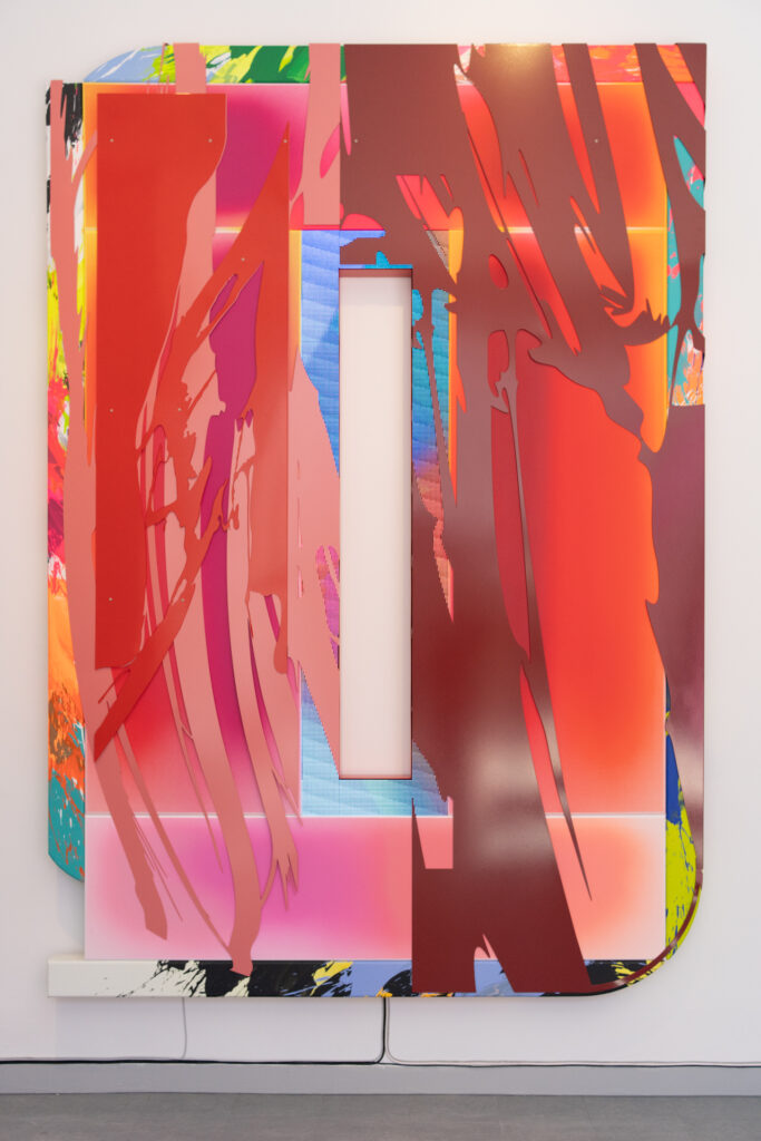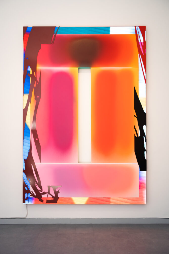Márton Nemes’ work is influenced by techno subcultures; the explosion and rearrangement of the pictorial field gives a psychedelic character to his abstract paintings that evoke the visual atmosphere of nightclubs. Combining painterly and sculptural elements, his multimedia installations create a hypnotic spatial dynamic that propels the viewer from the harsh, real world into a dizzying, fluorescent colour field.