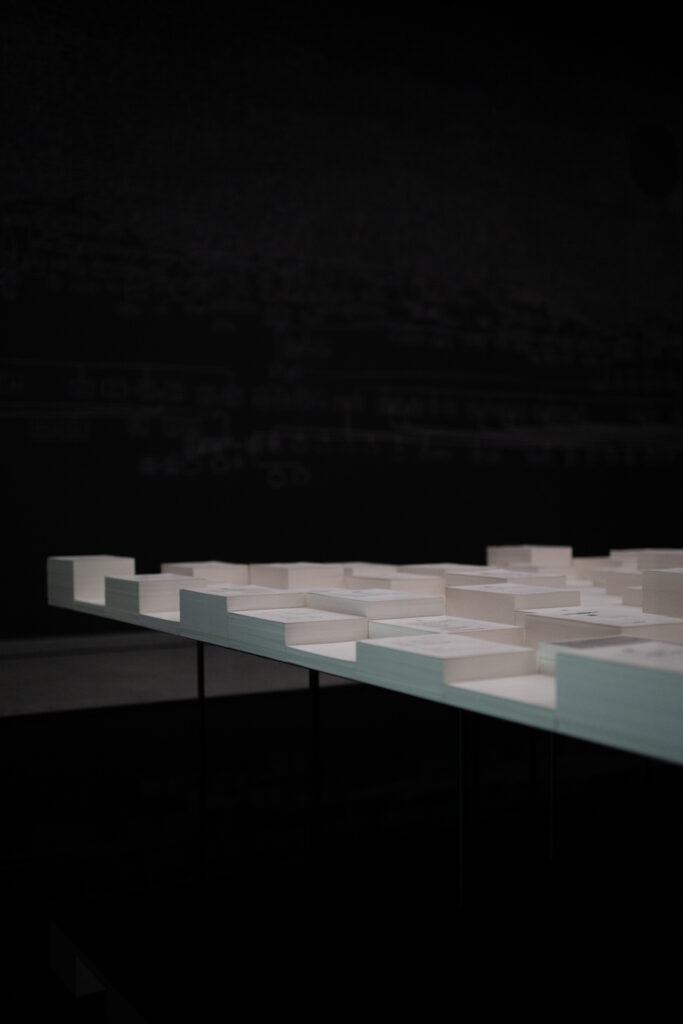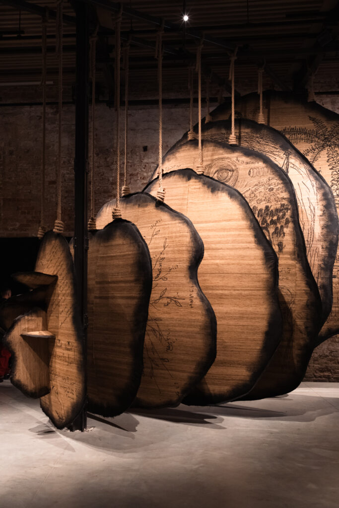 Handwritten across the walls and ceiling, the family tree engulfs the audience. The education materials refer to the transmission of knowledge and what is left out of history. Kamilaroi and Bigambul words in the drawing assert Indigenous language revival initiatives, while holes signal colonial invasions, massacres, diseases and displacement that sever familial ties. The central reflection pool is also a void; a memorial to First Nations deaths in state custody attended by piles of coroners’ reports. Archie adds archival records referencing kin to demonstrate how colonial laws and government policies have long been imposed upon First Nations peoples. These bureaucratic papers documenting tragedies are cradled by the reflection of the family tree in the surrounding water. The artist uses his family history to make systemic issues uncomfortably tangible to audiences while providing a prescient reminder that we are all kin.