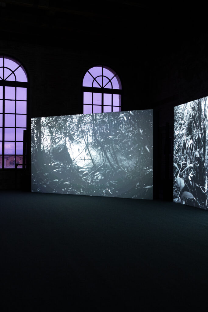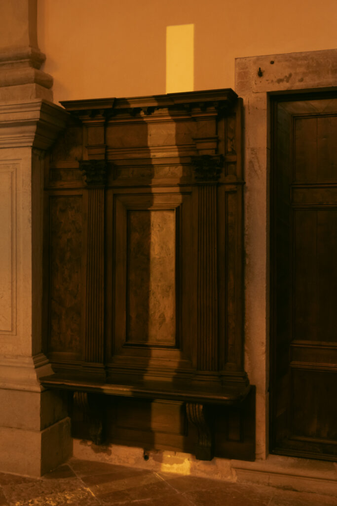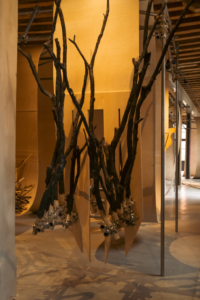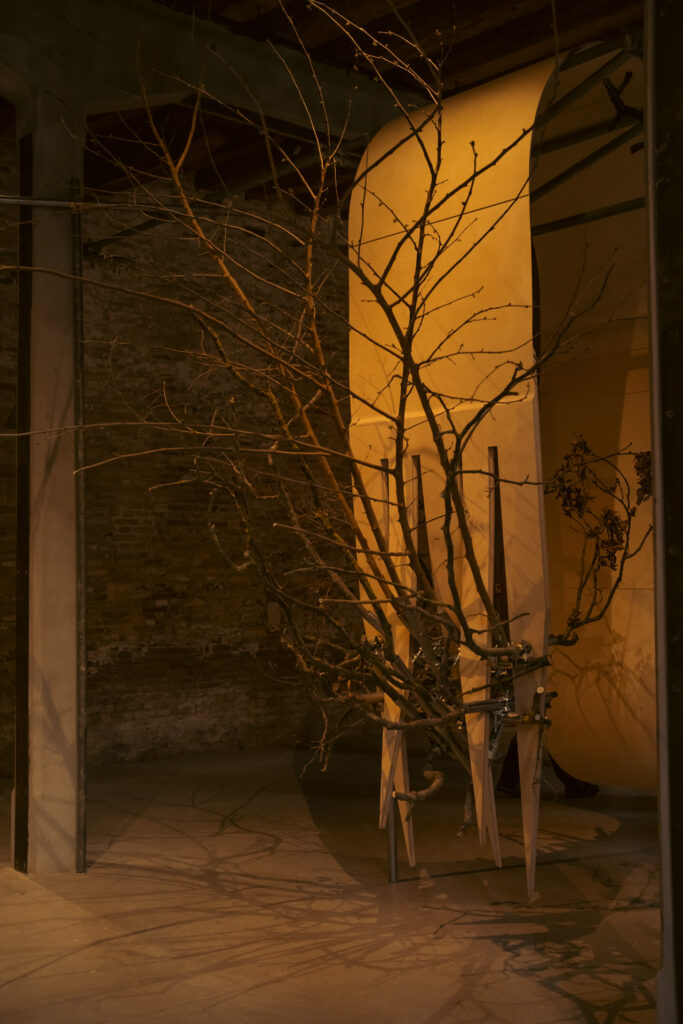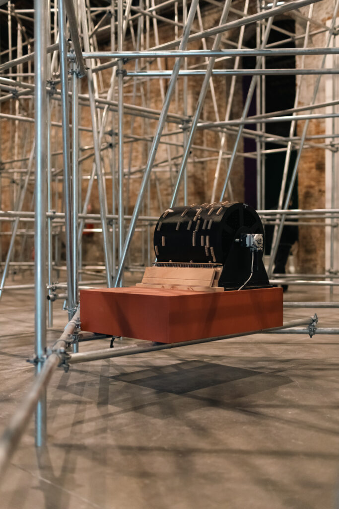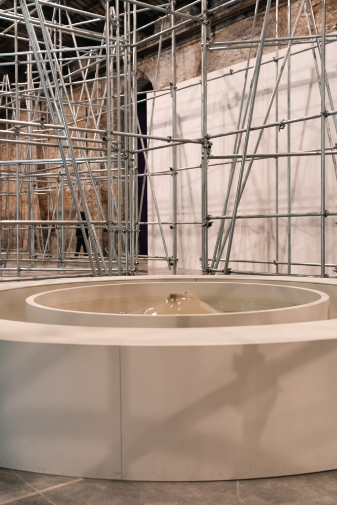 Designed with two entrances, the exhibition Due qui/To Hear — presented with support from the Italian Ministry of Culture’s Directorate-General for Contemporary Creativity — moves through three spaces built around various acoustic experiences and meeting points, suggesting the highly relational nature of sound. Visitors can enter an almost empty room where they are welcomed by a small sculpture of a Pensive Bodhisattva, a Buddhist figure who prefers thought to action. The drone of an organ pipe creates a sense of frozen time, a space of waiting. In the central room, a large scaffolding of pipes has been transformed into an organ playing a melody composed by Caterina Barbieri and Kali Malone. Visitors can walk through and sit down on a circular bench. At its centre is a pool where a wave constantly rises and falls, prompting a form of meditation, even a trance state. Coming out into the garden, they can listen to two stories about the cycle of birth/death (and regeneration): that of a tree (by Nicoletta Costa) and that of a human being (by Tiziano Scarpa). Further on, they will also hear a choral work (by Gavin Bryars). Hanging in the branches of a tree, these voices sing of a person who feels roots growing through him. They pin him down, but also bring him closer to others, to the Whole…