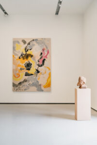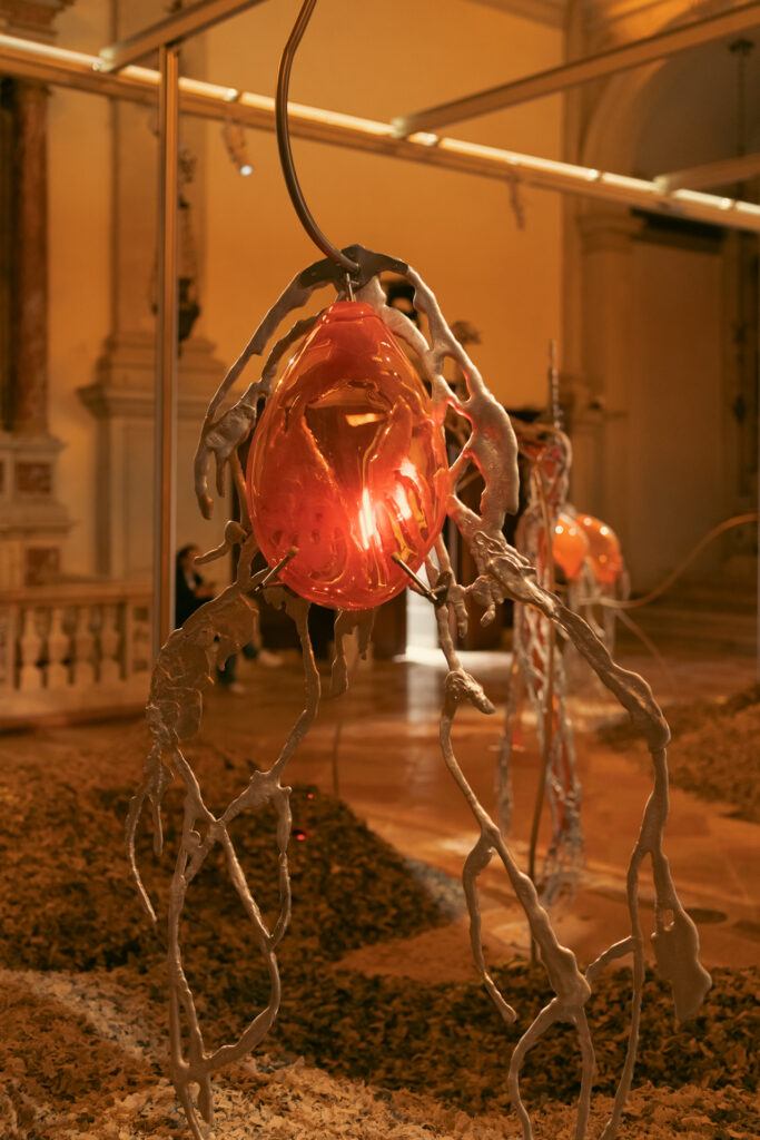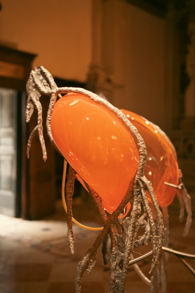 The fused aluminium and glass sculptures by Pakui Hardware resemble enlarged nervous systems and swollen organs. They were moulded on scorched earth (the aluminium elements) and shaped in sweltering heat (the glass elements). In the paintings by Rožanskaitė, unnamed diseases, sterile operating theatres and medical consultation rooms, visceral-themed assemblages, and machine-like objects irradiate a chronic inflammation of the cosmic flesh.