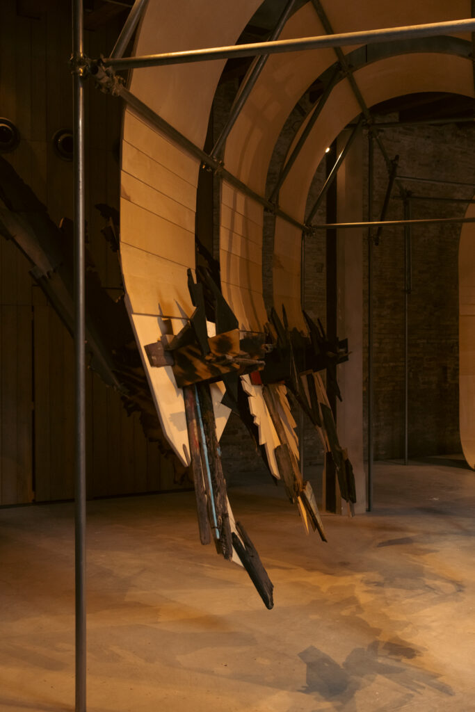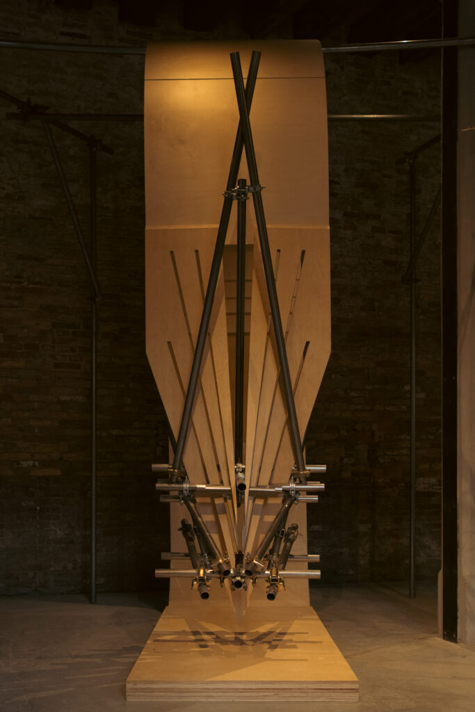In Hope the Doors Collapse, Luciana Lamothe intertwines pieces of wood and pipes, people and structures, and mutability and permanence to create spaces inside spaces that modulate forms of violence and care in a tense balance of interdependent bodies. The work establishes matter as the principle of the real to effect a series of changes in traditional construction methods and in the relationships we form with our environments and with each other. The artist extends her research into the functions, limitations, and potentials of materials and their interactions with architecture to subvert some of its imperatives. The tangle of steel and wood thus positions us in an environment whose material forces manifest their agency and erode the anthropocentric ontology of modernity. Each of the four sculptures serves as an enveloping and habitable space proposing a different way of conceiving our connection with the material world. They contain both forms of care and aggression that appear in the cuts, slashes, assemblages, and twists required for the work to maintain its shape: a series of wounds and sutures that recognize the weight of centuries of social, spatial, and material conditioning. The work’s entanglement enunciates an ecology in which bodies, objects, and structures fracture the borders separating culture and nature, human and non-human, to imagine material alliances for other possible ways of living together.